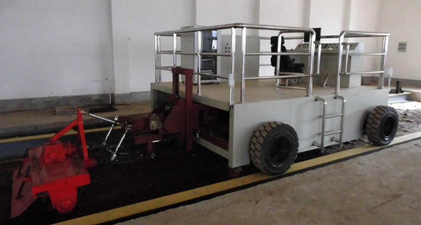 土槽试验车采用变频电机驱动前后桥的四轮自走式结构,采用橡胶轮胎在已建成的土槽两旁的轨道上行驶,通过调整驱动变频电机转速控制行驶速度,在轨道内侧设置弹性限位轮以防跑偏;动力输出采用变频电机液压泵站液压马达驱动。试验车主要由机架、驱动系统、动力输出系统、液压系统、土壤恢复喷淋系统、控制系统及制动系统等部分组成,能够满足土壤耕作部件(如:犁,耙,铲,开沟器,旋耕等部件)和小型农机具的试验研究。被测部件可以在土槽车上作横向及垂直方向调整。