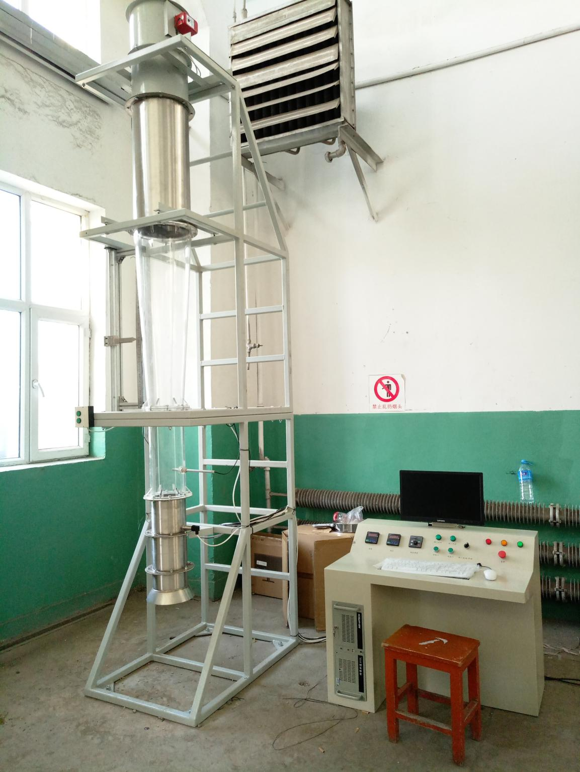 农业物料悬浮试验台采用轴流风机负压吸风的形式,通过采用变频器调整轴流风机不同转速,改变物料悬浮管道内的风速,获得被测不同物料悬浮于锥筒的不同位置。采用有机玻璃制造的透明锥形观察管和圆柱稳流直管,测定试验装置可视性好;管道风阻小,且稳定性能好。采用风速风压传感器通过工控计算机采集信号,测量风速和管道动压,进行实时分析处理。
